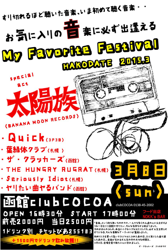 ◆出演:太陽族、Quick、葉緑体クラブ、THE HUNGRY RUGRAT、Seriously Idiot、ヤりたい曲ヤるバンド 、ザ・クラッカーズ