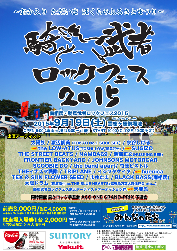 ◆出演:太陽族、渡辺俊美、泉谷しげる、THE LOW-ATUS、SUGIZO、THE STREET BEATS、NAMBA69、磯部正文(HUSKING BEE)、FRONTIER BACKYARD、JOHNSONS MOTORCAR、SCOOBIE DO、the band apart、竹原ピストル、THE イナズマ戦隊、TRIPLANE、huenica、イシワタケイタ、TEX & SUN FLOWER SEED、まゆたま、BLACK BASS(南相馬)、太陽ドラム、天邪鬼
